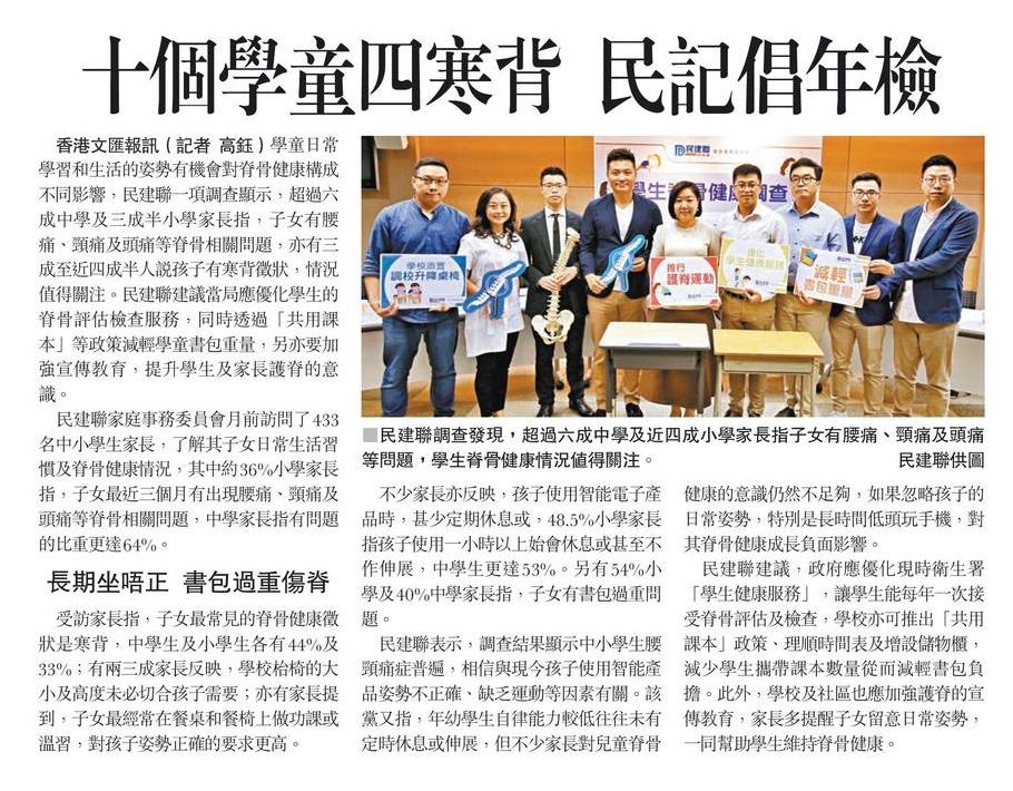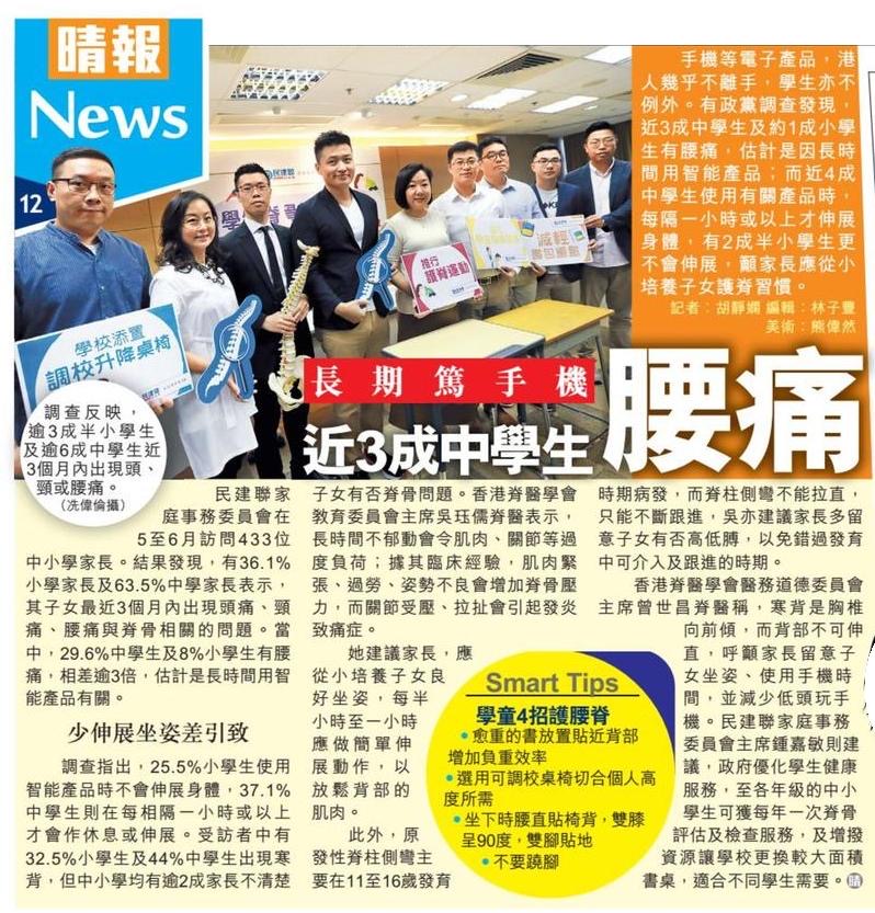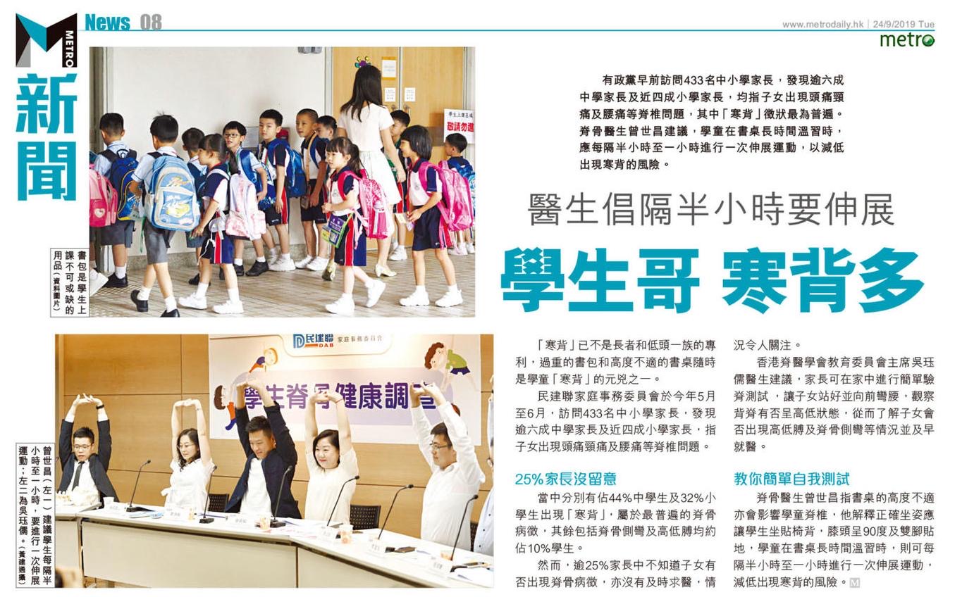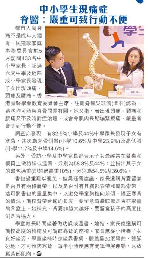 【東方日報】有政黨進行學生脊骨健康調查,顯示超過6成中學生和近4成小學生的家長,在最近3個月內發現子女出現頭痛、頸痛或腰痛的問題,其中有逾2成小學家長不知道子女出現脊骨問題,逾3成中學生在做功課或溫習超過1小時後才會休息,情況令人關注。 調查訪問433名中小學生的家長,36.1%小學生家長、63.5%中學生家長發現子女脊椎附近的肌肉出現痛楚,有關肌肉痛楚多是由於肌肉緊張、過勞所致,有可能會引起脊柱的功能性移位,從而引伸至寒背、脊柱側彎的問題。調查亦顯示有32.5%的小學生家長、和44%的中學生家長認為子女出現寒背。 香港脊醫學會教育委員會主席吳珏儒指,多數家長所發現的寒背問題,多只是姿勢不當,而非脊椎疾病。她指,香港成年人中有70%至80%曾出現腰背痛,而問題出現年輕化的現象,是次的研究結果令人擔憂,她說:「脊柱的健康和牙齒的健康一樣重要,應該要從小養成良好的生活習慣。」